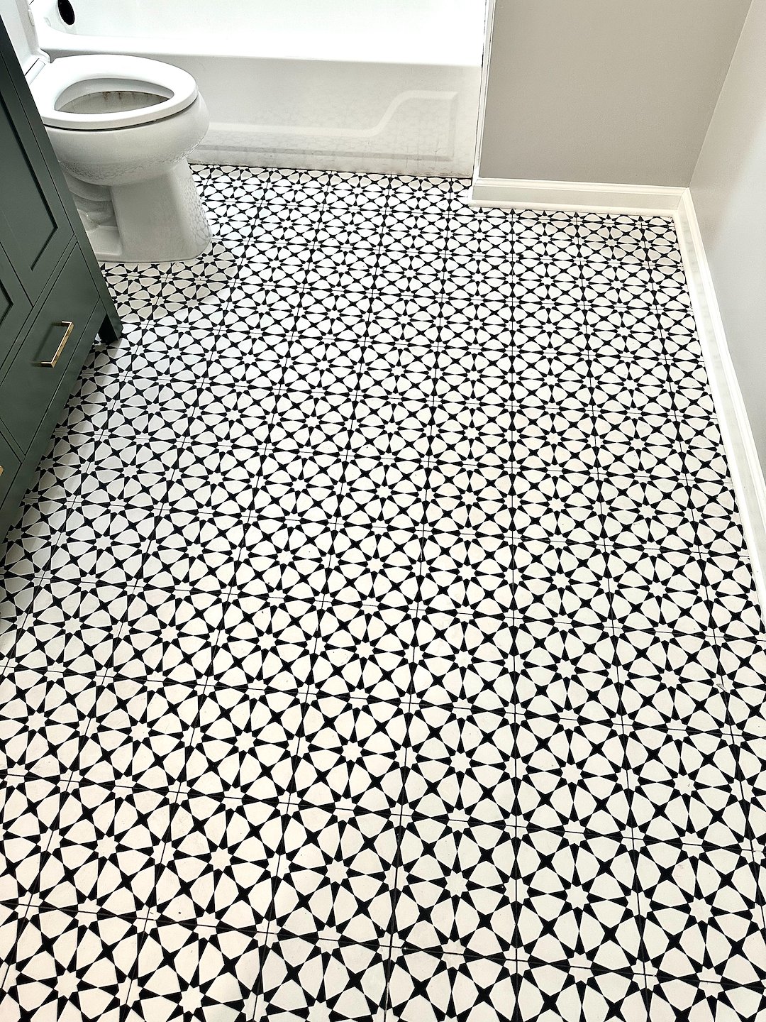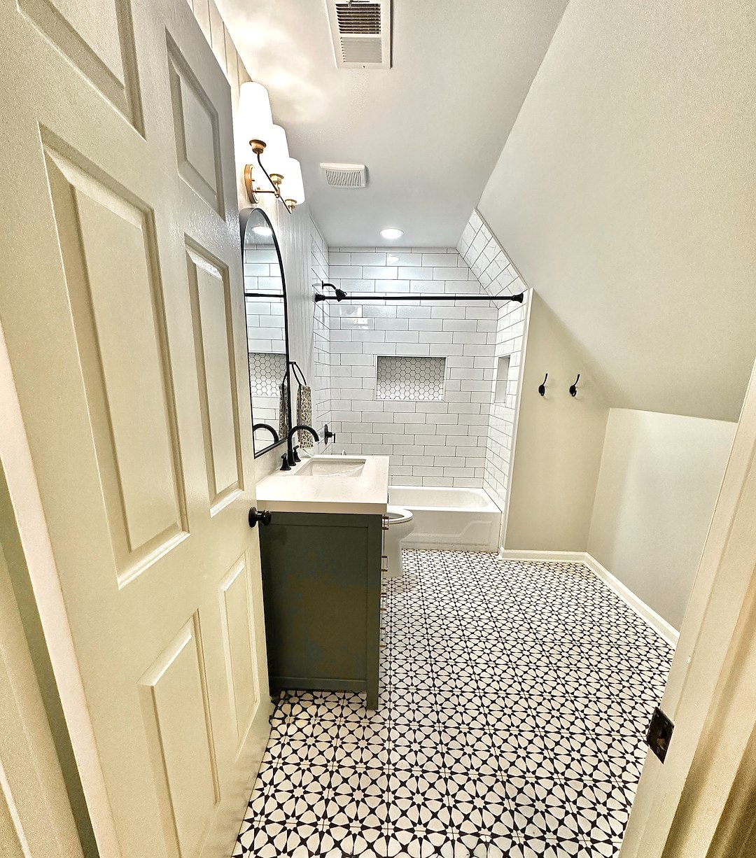 8-by-8 floor tile in a fun, geometric design was installed and grouted. All changes of plane were caulked and tile surfaces were cleaned and inspected for a uniform finish.