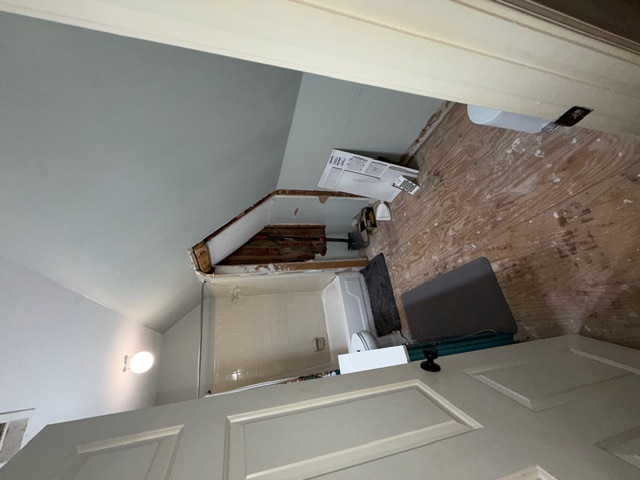 Plumbing demolition exposed the shower and tub plumbing walls so we could remove the existing valve, trim, supply lines, and drain components that needed to be reconfigured. All active water supply lines were capped and secured to leave a safe, shut condition for the rough-in phase. The subfloor beneath the vanity and toilet was removed where damaged, and we cut clean edges to allow proper future patching while checking floor framing for structural or moisture issues.