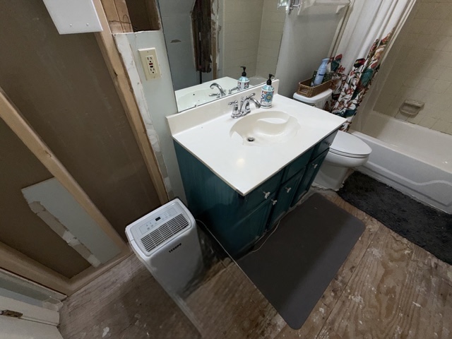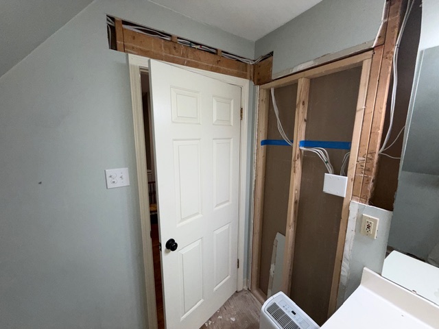 Demolition work included removal and off-site disposal of the vanity, countertop, mirror, vanity light, and all bathroom hardware such as towel bars and toilet paper holder. The existing toilet was disconnected and removed, and we tore out the tile tub surround down to the wall framing and hauled all debris away.