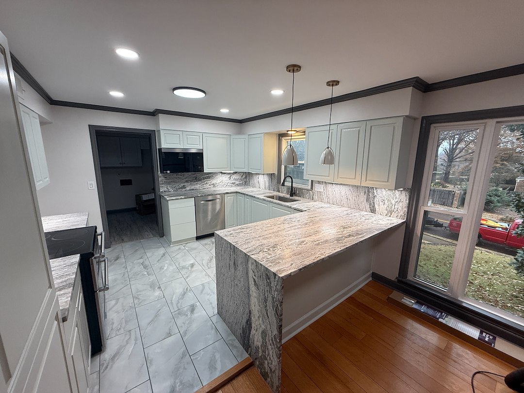 The electrical upgrades included new GFCI outlets around the countertop areas and new recessed lighting throughout the ceiling to improve overall illumination. We also added under cabinet lighting to brighten work surfaces and new pendant lights above the waterfall bar top to highlight the island and create a focal point.