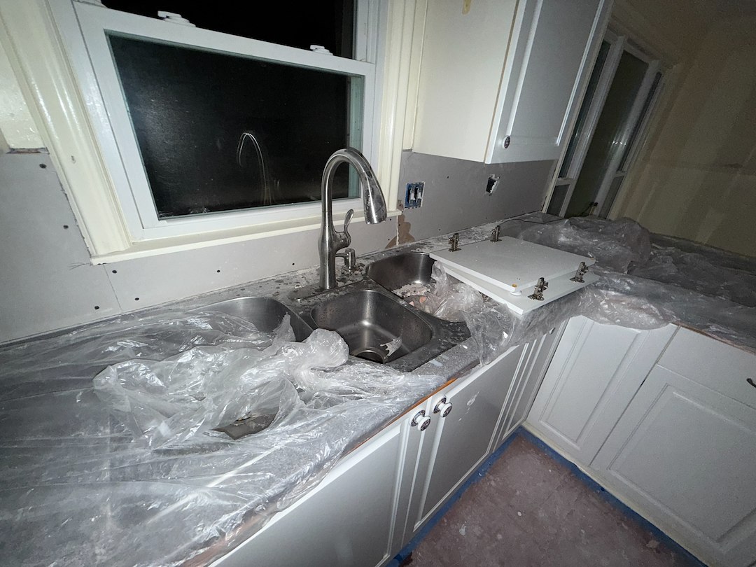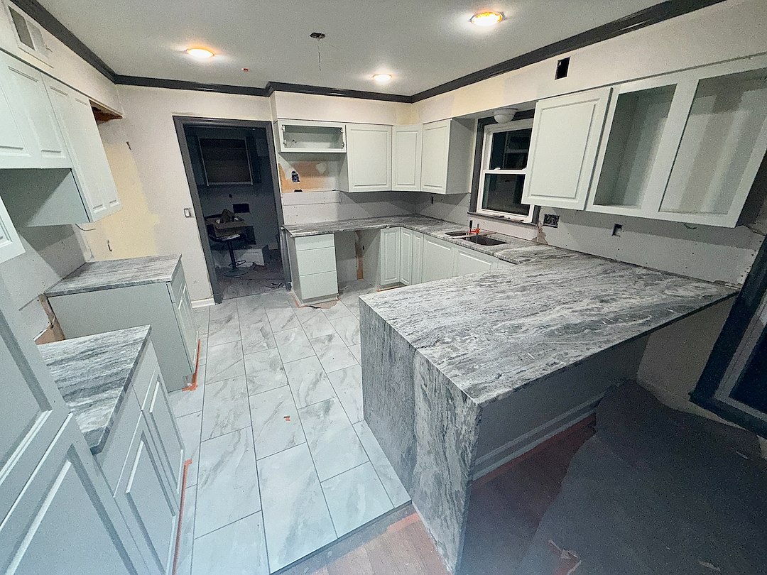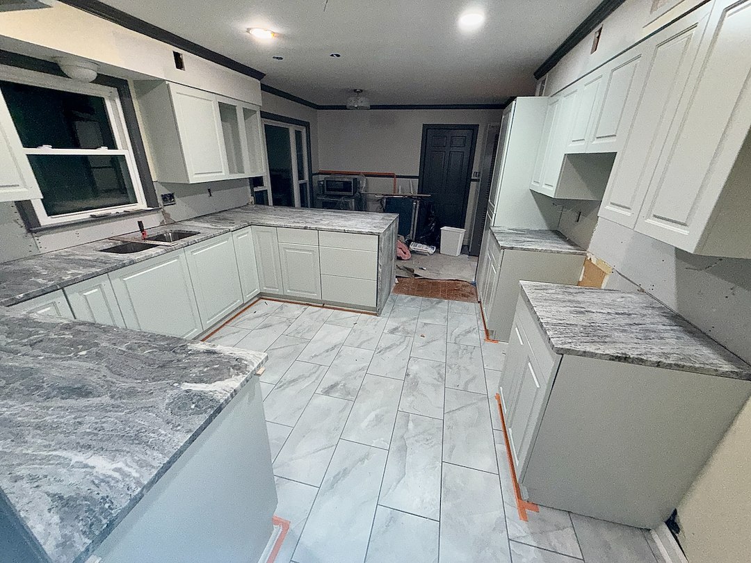We replaced the subfloor to ensure a stable base, then installed large format ceramic tile flooring for a clean, durable surface that works well in a busy kitchen. With the floor and footprint set, we proceeded with upgraded plumbing and electrical work to support the new layout and appliances.