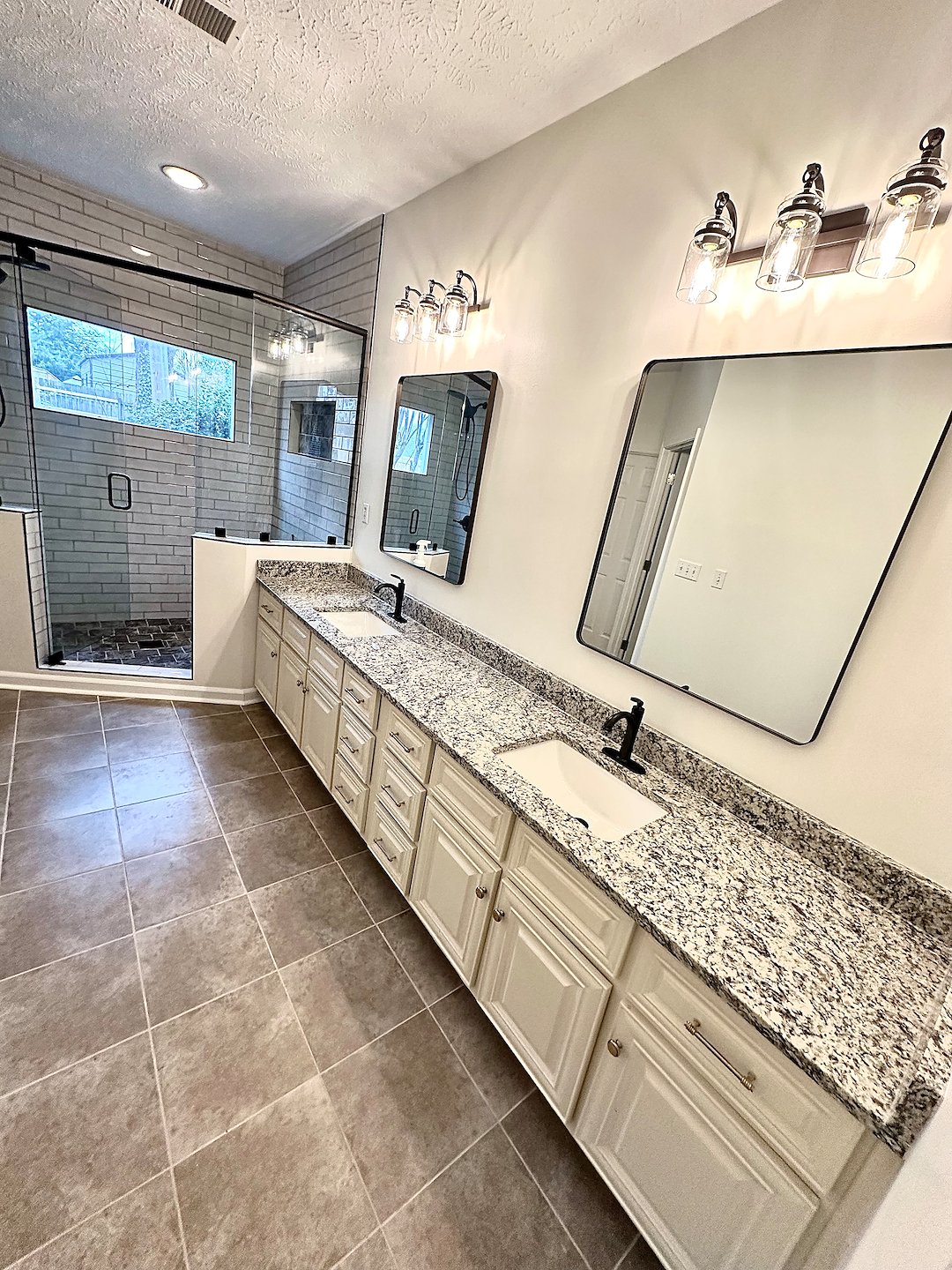 New granite tops and backsplash were measured and installed on the double vanity. The granite was cut to fit the basins and backsplashes precisely, then sealed for durability. New mirrors and light fixtures were mounted above the vanity to complete the updated sink area.